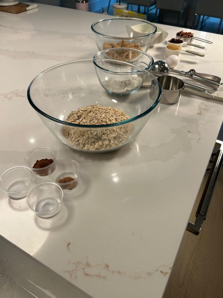 - Whisk together the oats, flour, cinnamon, nutmeg, baking soda, and salt in a large bowl.