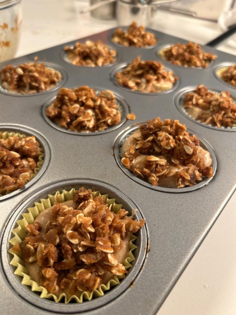 - Use an ice cream scoop to divide the batter evenly between the 12 muffin cups.