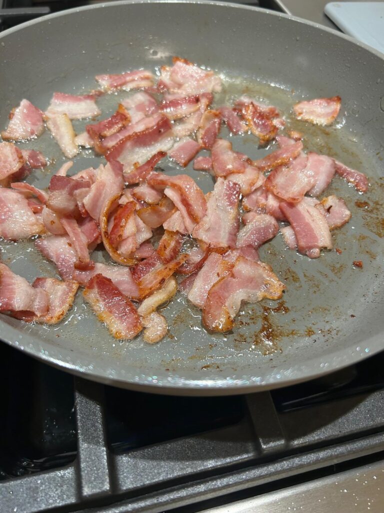 • Meanwhile, heat a medium skillet over medium heat and add the chopped bacon. Cook until crispy and the fat has rendered.