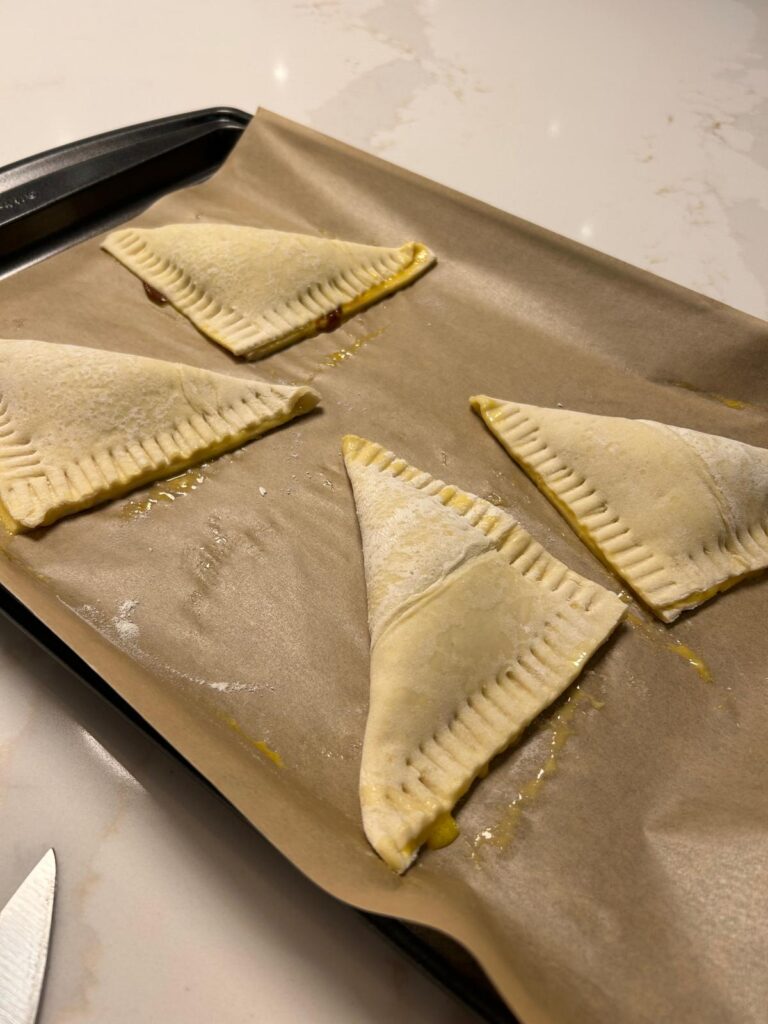 • Brush the edges of the pastry with the egg mixture, then fold one side diagonally over the other to form a triangle. Press the edges to seal.