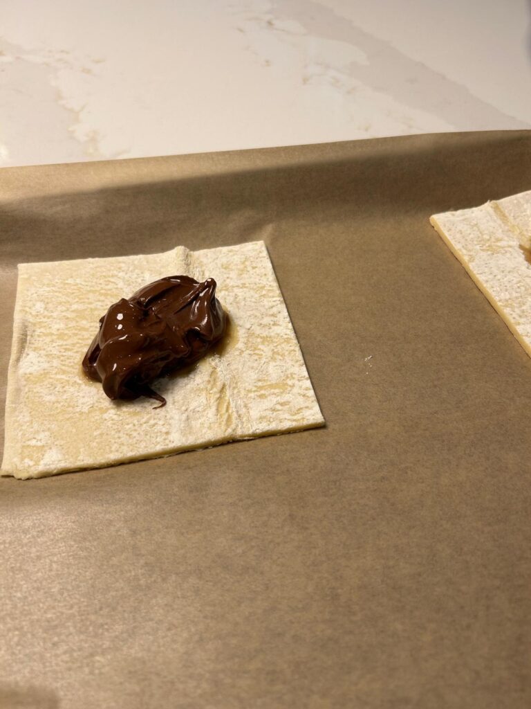 • Place a heaped teaspoon of Nutella into the center of each square.
