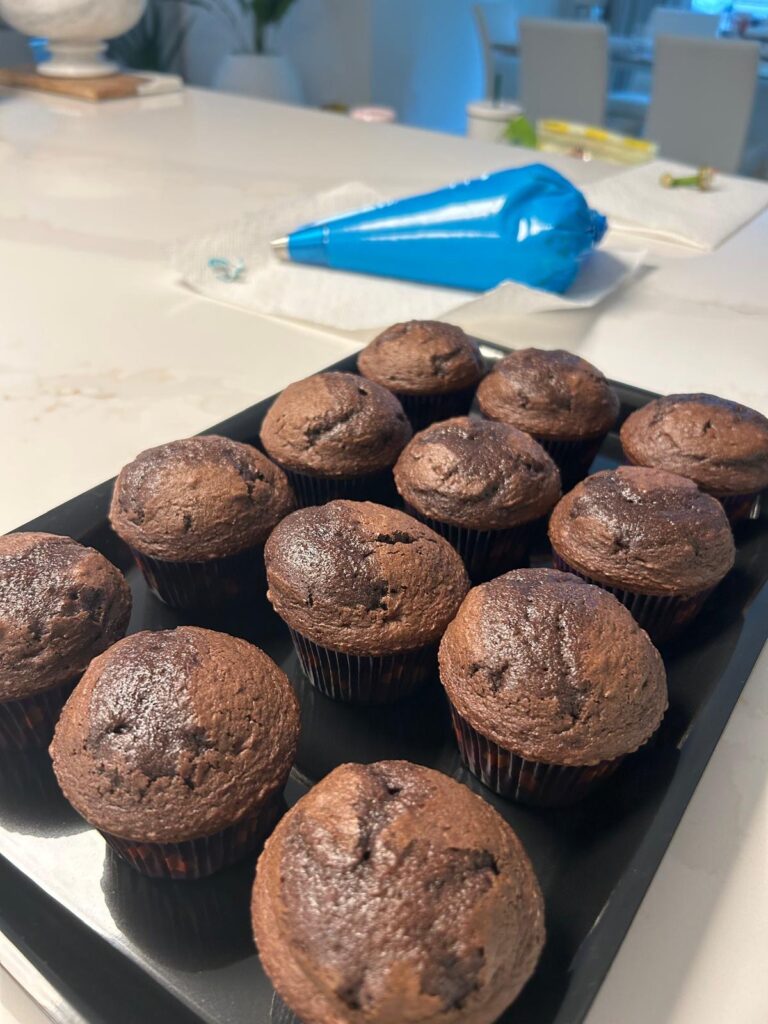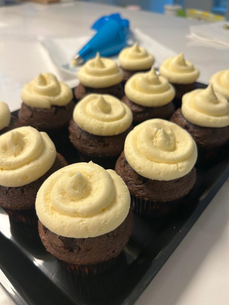 - Place the frosting into a piping bag and snip off the end. Pipe the frosting in circular swirls on top of the cooled cupcakes.