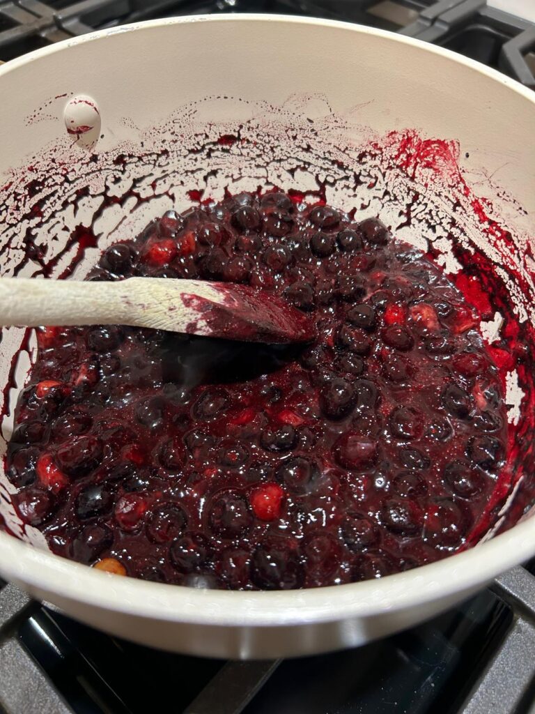 - In a pan over medium heat, cook the blueberries for about 5 minutes until they’ve released their juices. Stir in the chia seeds and cook for another 3–4 minutes until it starts to thicken. Add the honey, stir well, and set aside to cool.