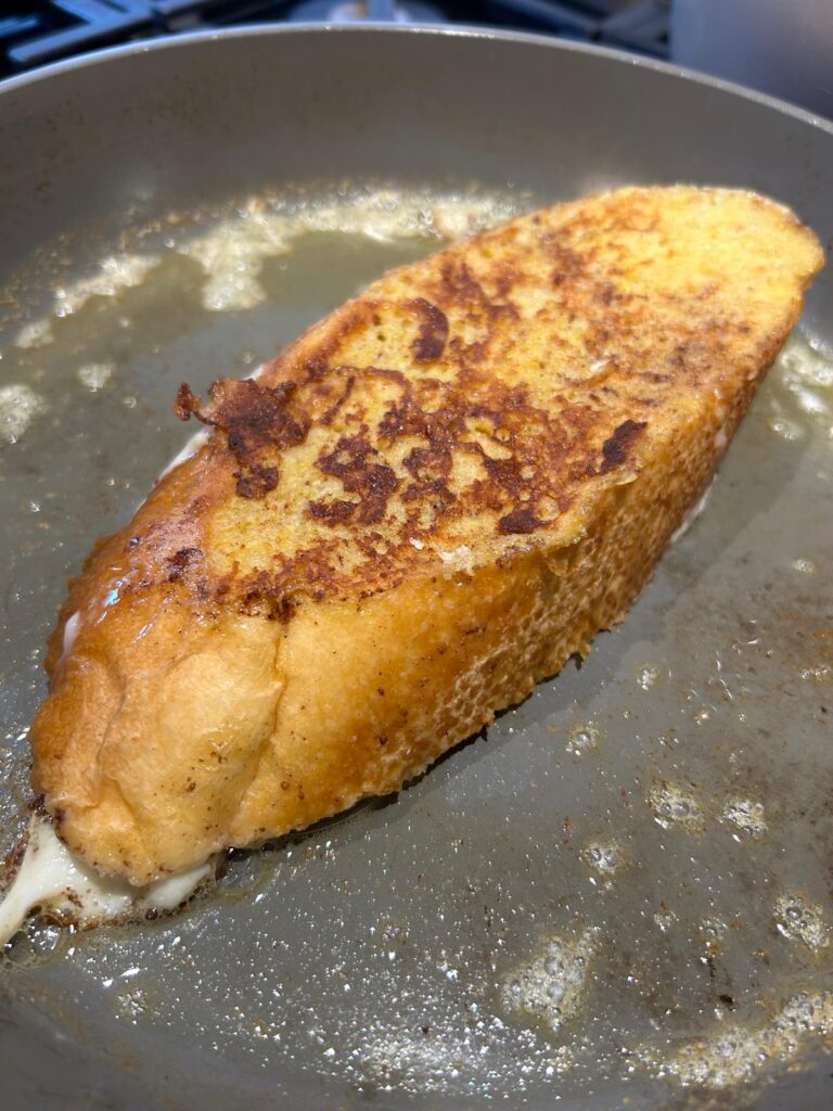 - Heat a pan over medium heat and add a little butter or oil. Fry the soaked bread for about 3 minutes on each side, until golden and slightly crisp.