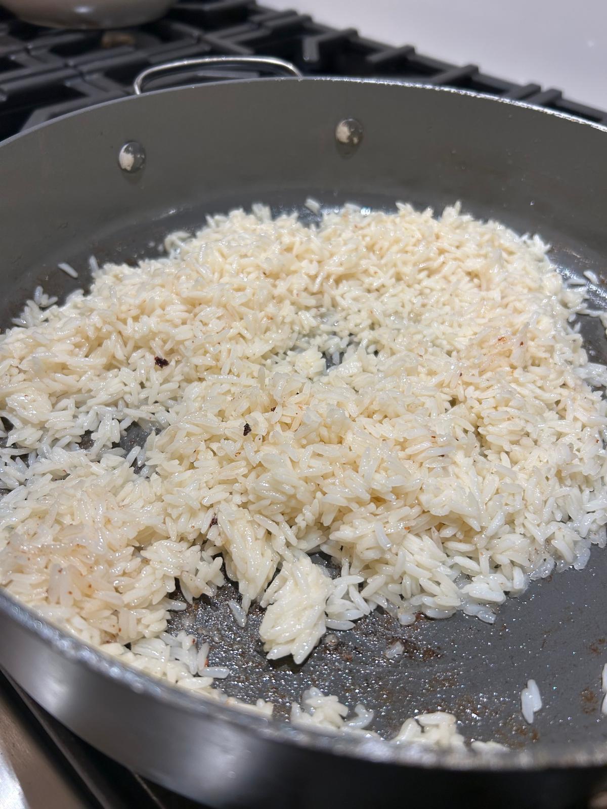 • Add two eggs to the skillet and stir to scramble. Once beginning to set, mix them in with the rice.