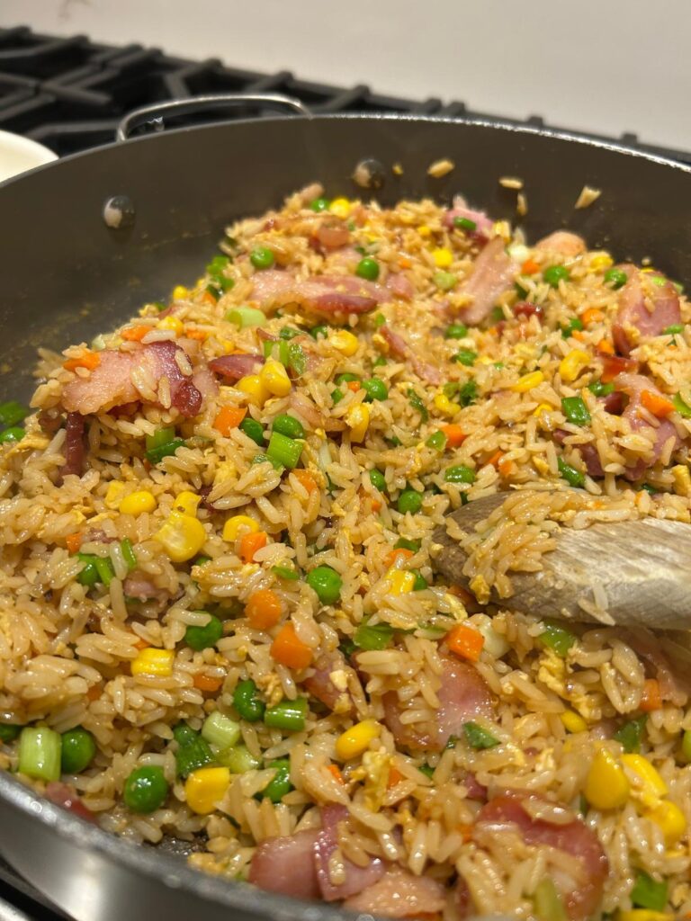 The beauty of this recipe is in its simplicity. Using microwave jasmine rice means you can have this on the table in just 25 minutes without compromising on texture. The trick is to fry the rice in a little bacon drippings so it crisps up beautifully and absorbs all that smoky, salty flavor. Then, toss in a handful of frozen veggies and some scallions for freshness and color. The result is a bowl that’s satisfying, balanced, and full of flavor in every bite.