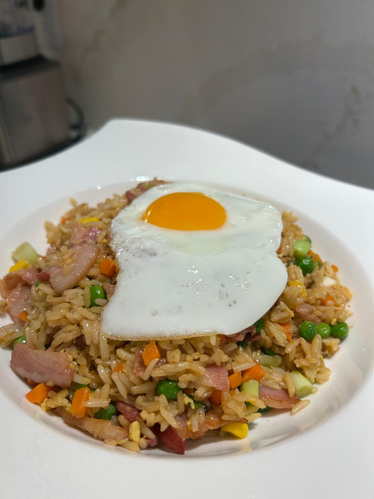 • Serve the rice in bowls, top with a fried egg, and sprinkle over the cooked bacon. Breakfast is served.
