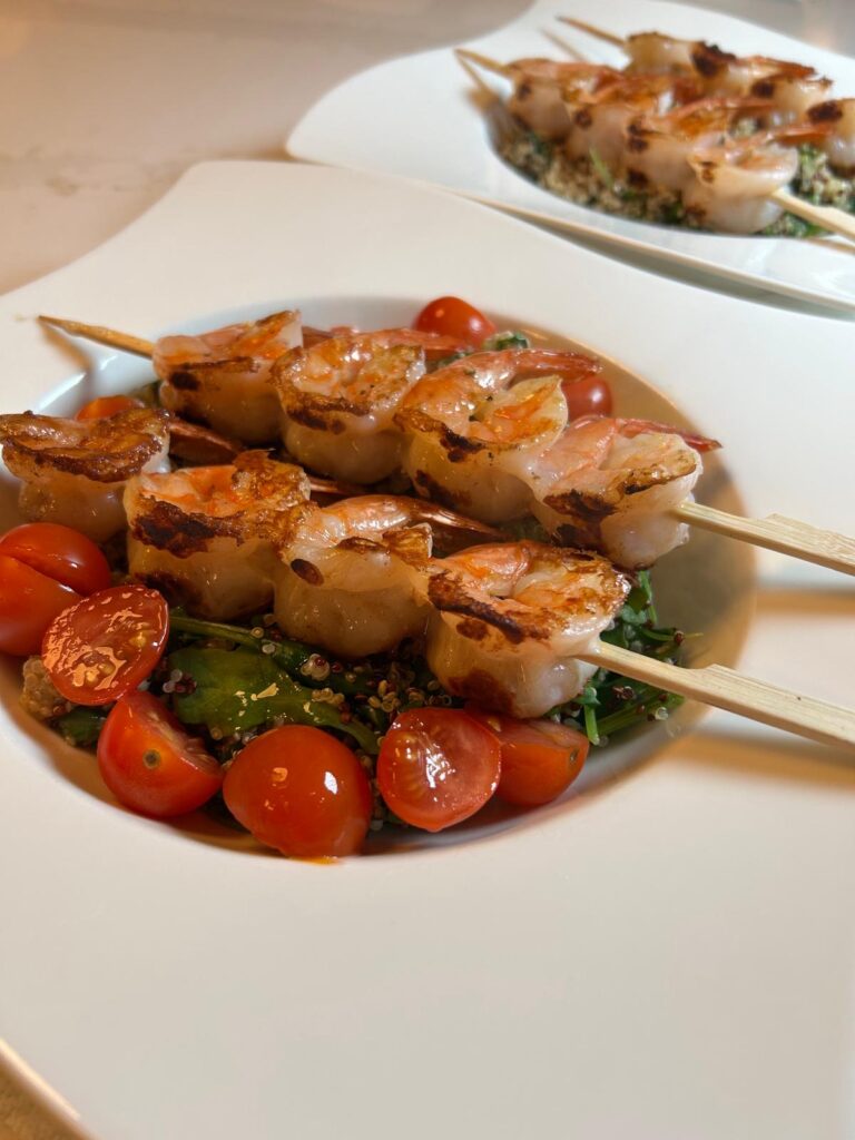 - Sprinkle with cherry tomatoes and lay the shrimp skewers on top
