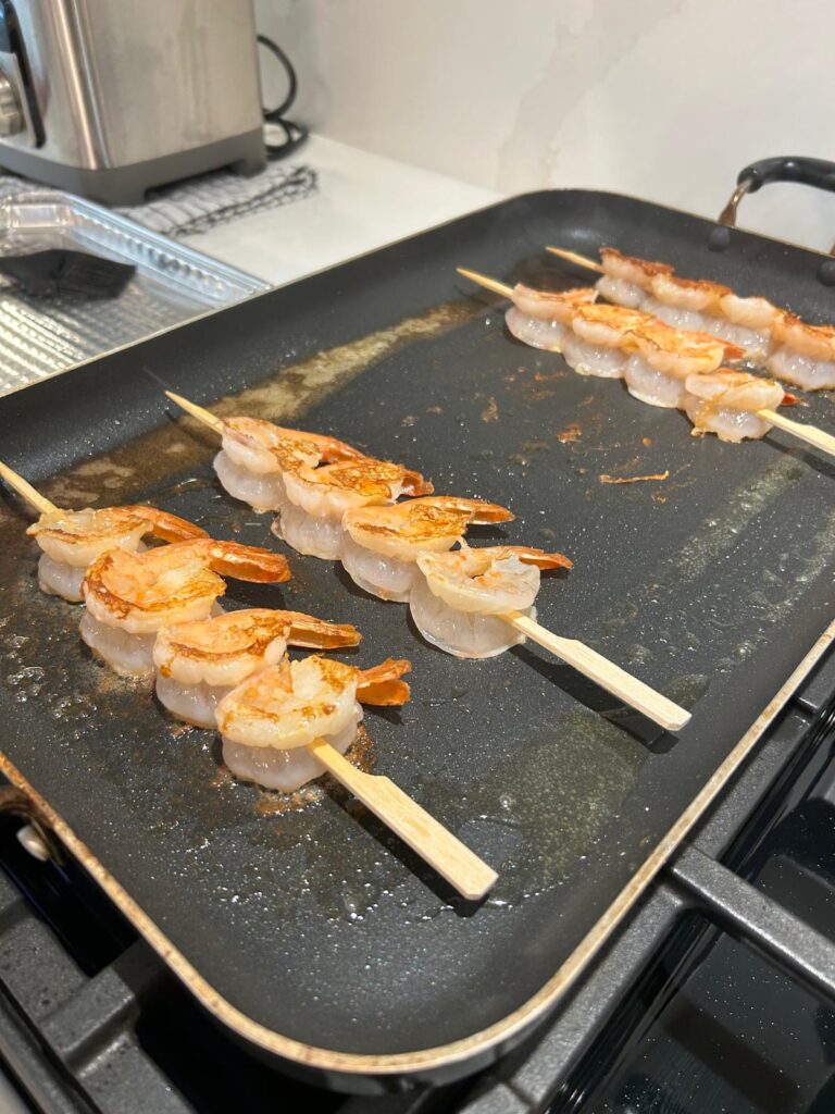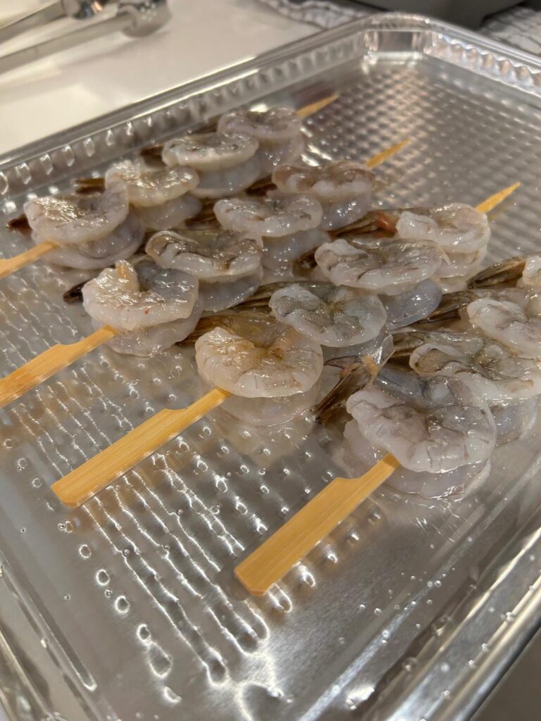 - Thread the shrimp onto wooden skewers that have been soaked in water for at least 30 minutes and set aside.