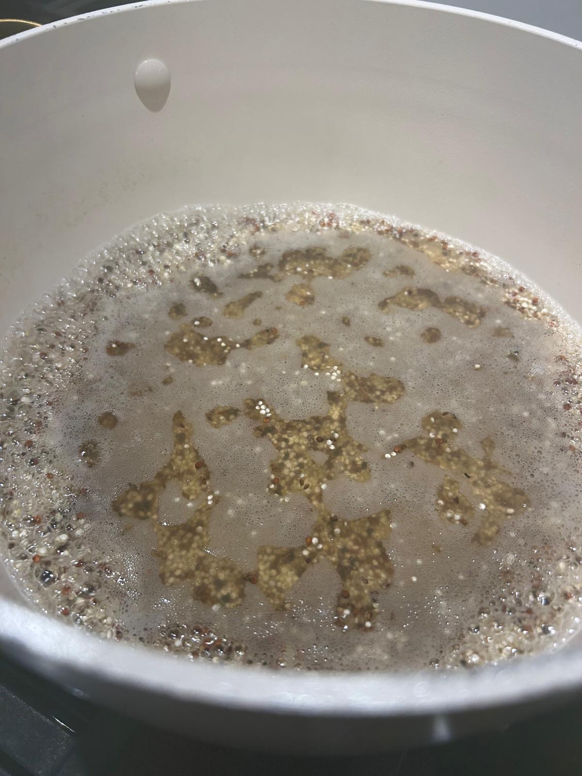 - Bring the water to a boil and add in the quinoa. Cook until all the water has been absorbed, then turn off the heat and place a lid on the pan.