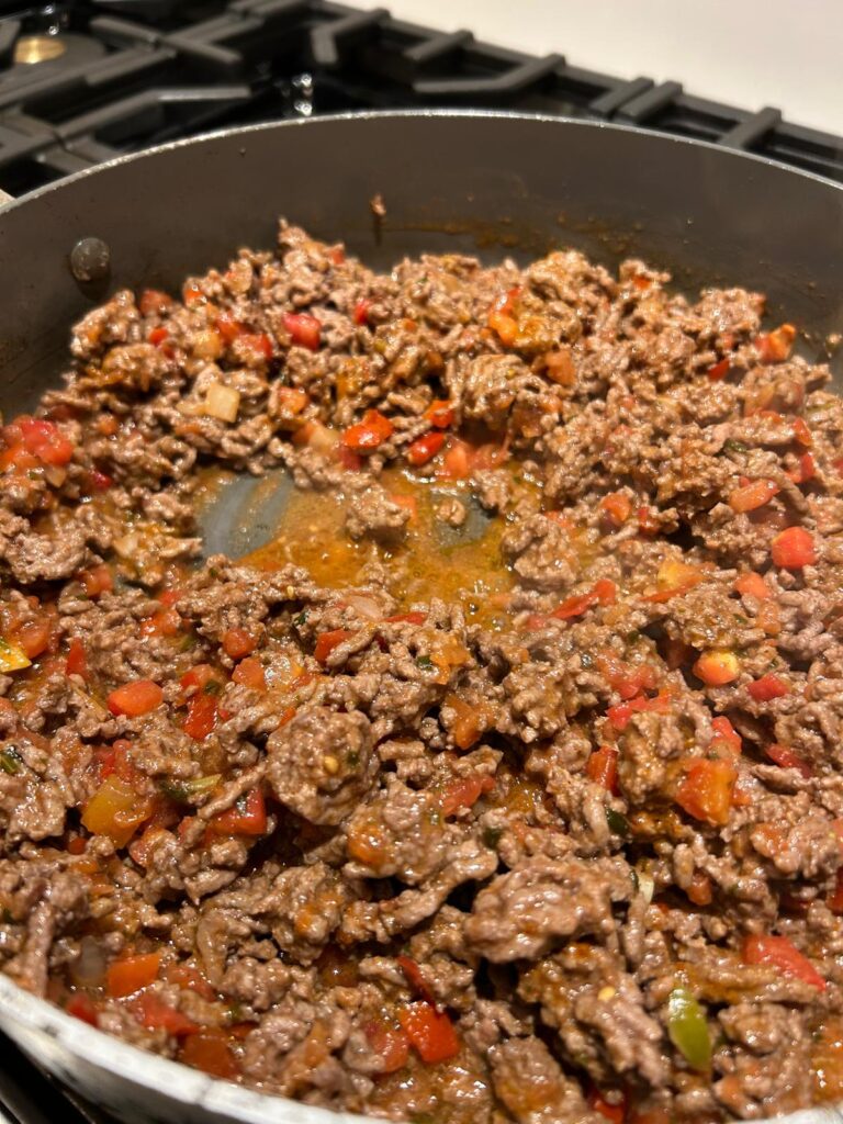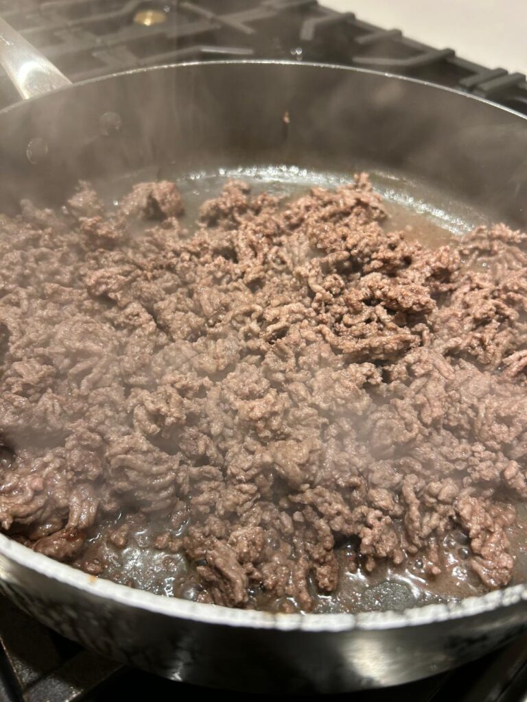 • In a medium skillet, heat a little flavorless oil over medium heat and brown the ground beef.