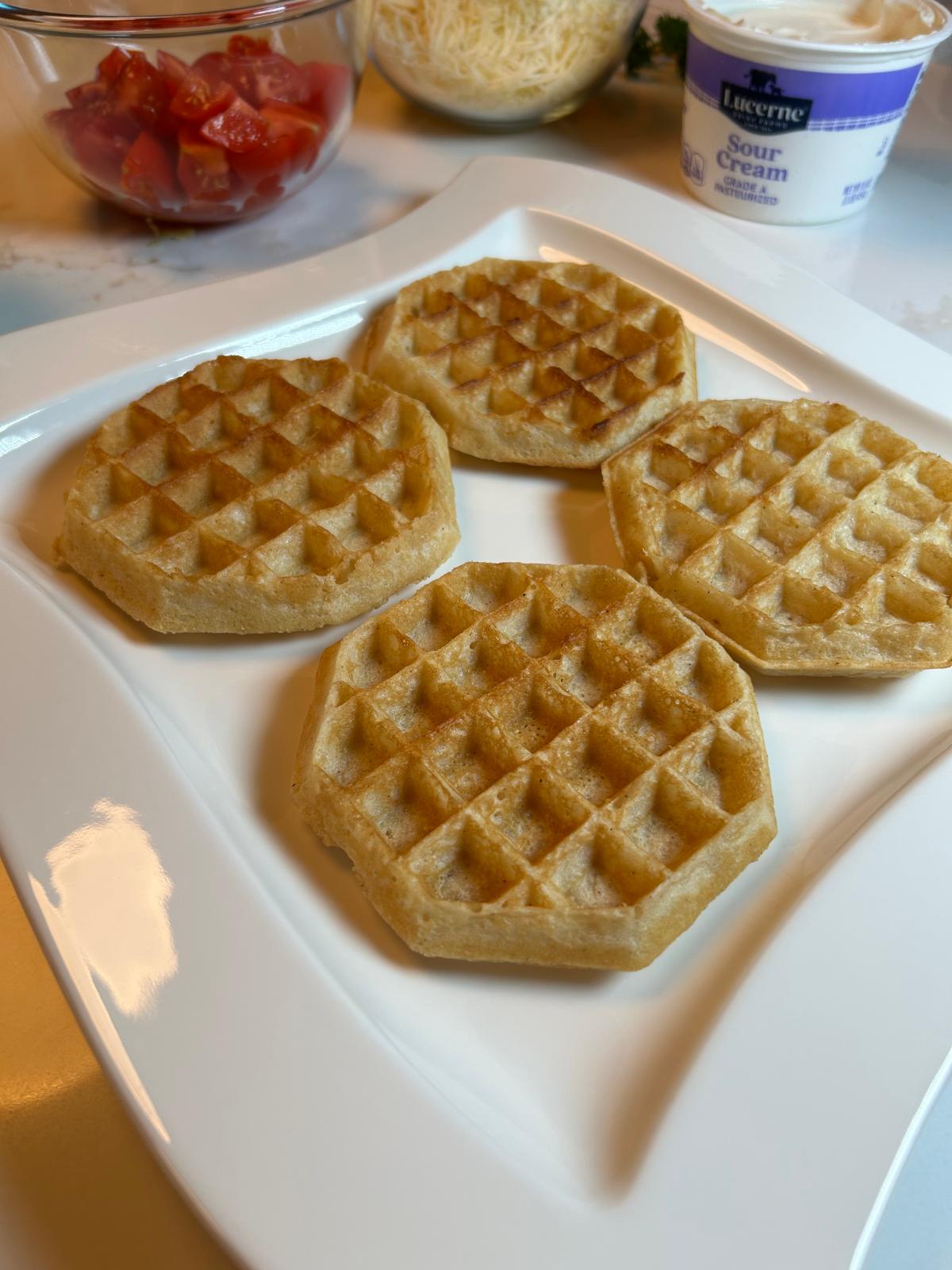 • Top each waffle with shredded lettuce, some of the beef mixture, chopped tomatoes, and diced avocado.