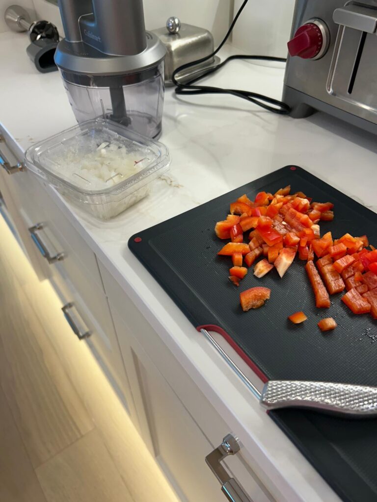 Remove the stem from the bell pepper and set aside. Remove the seeds from the pepper and cut into quarters. Place two quarters into a food processer along with quarter of a sweet onion and pulse until minced finely.