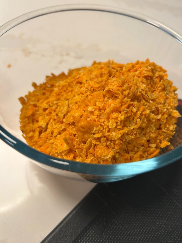 Place the ritz crackers or flavored chips into a plastic bag, seal and using a rolling pin, crush the crackers or chips until they resemble crumbs.